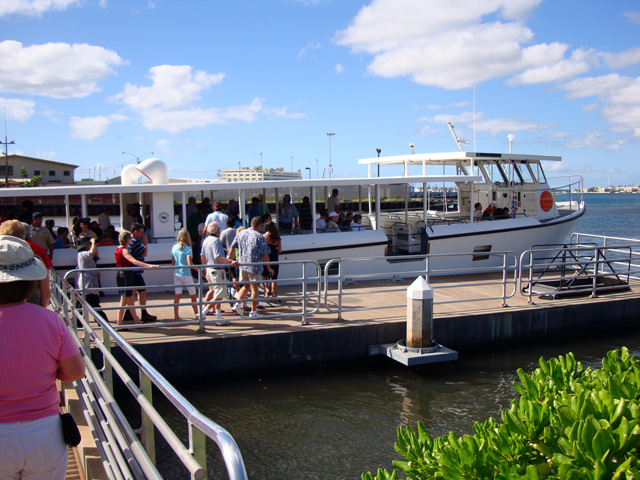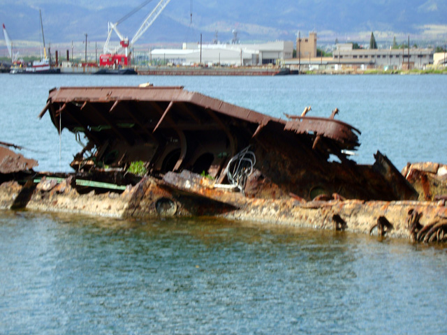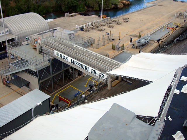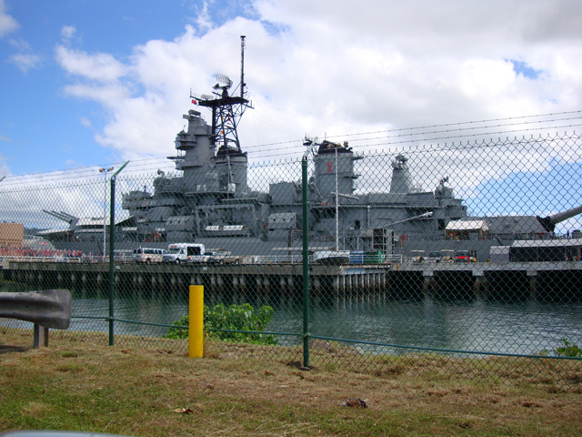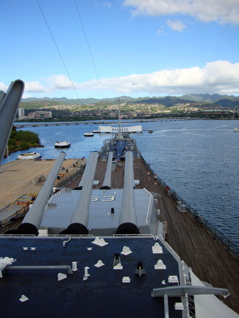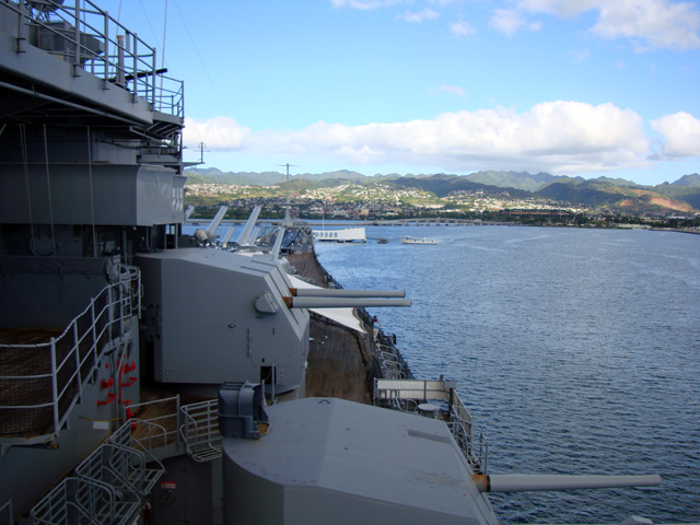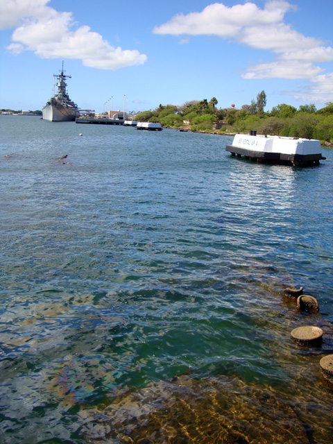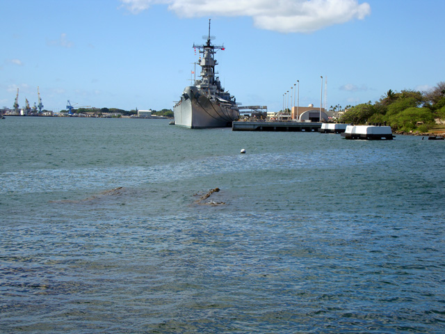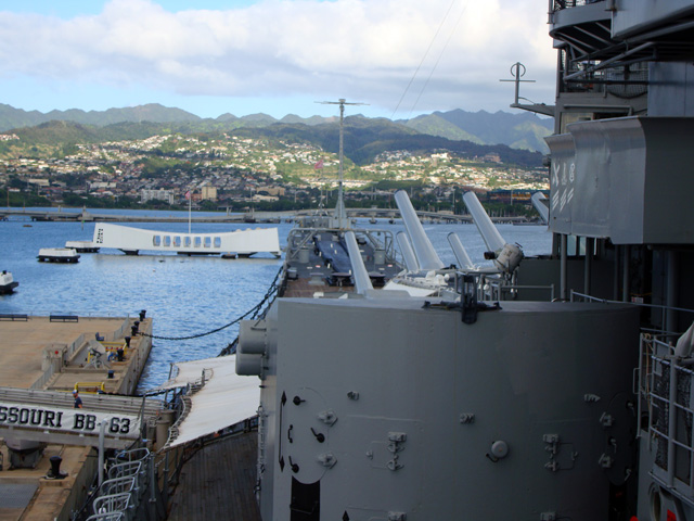 The site of the Arizona wreckage is over there on the right, under that white memorial that has been built above it, but not touching it. The battleship USS Missouri is on the left.