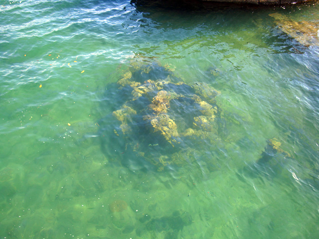 And now it rests below. After its sinking, the parts of the ship that were still above the water line were cut away for use as salvage and scrap metal.