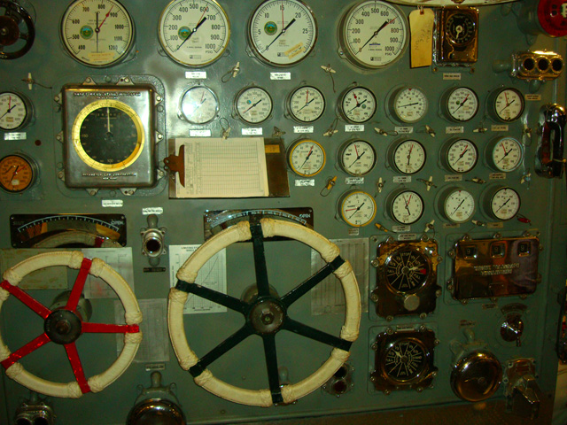 Controls for the boilers. Those wheels get hot, so they're wrapped in cord.
