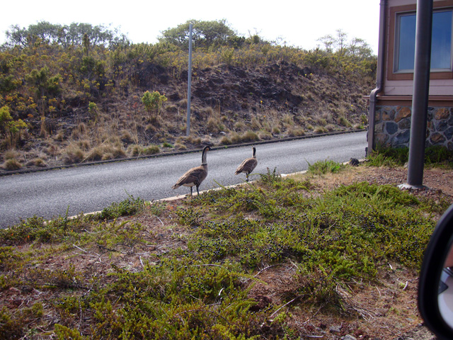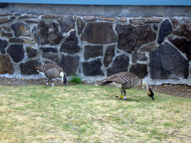 Incredible! They're nenes, Hawaiian geese, and it's unusual to see them just wandering around like this.