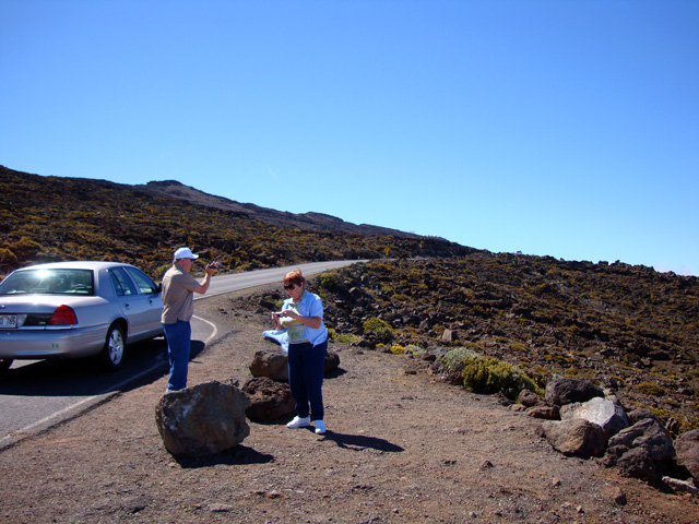 Which meant that every time we went nearly anywhere, we had to make a long drive. For our first day's excursion we drove down south to Maa'aea and then north, past Kahului Airport where we'd arrived, and then southeast up, up, up to the top of the volcano and Haleakala National Park.