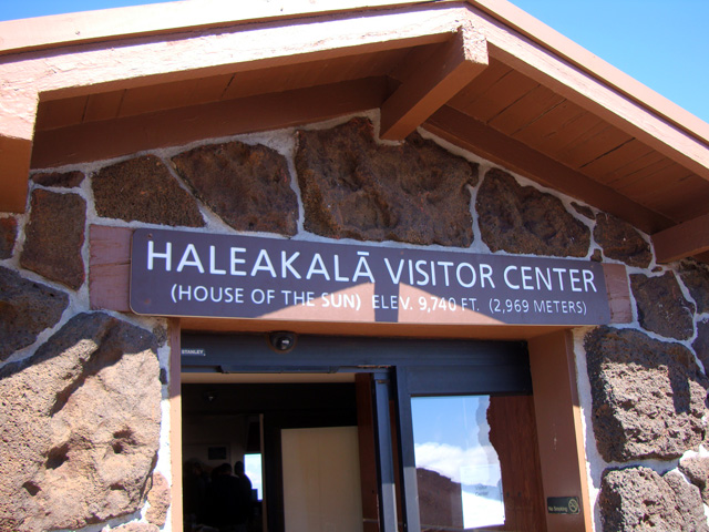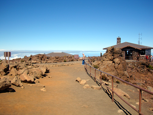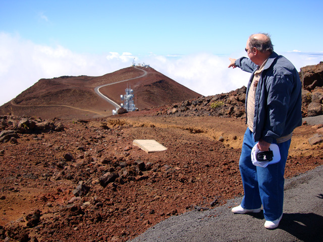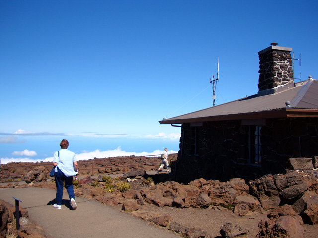 Bill's smiling, but he's cold. It's chilly up here at the Haleakala Visitor Center on top of the mountain, where the only T-shirts they sell are long-sleeved. The Visitor Center down below by the ocean sells only short-sleeved Tees. Bill doesn't want a long-sleeved T-shirt so he'll wait til tomorrow to get his souvenir.