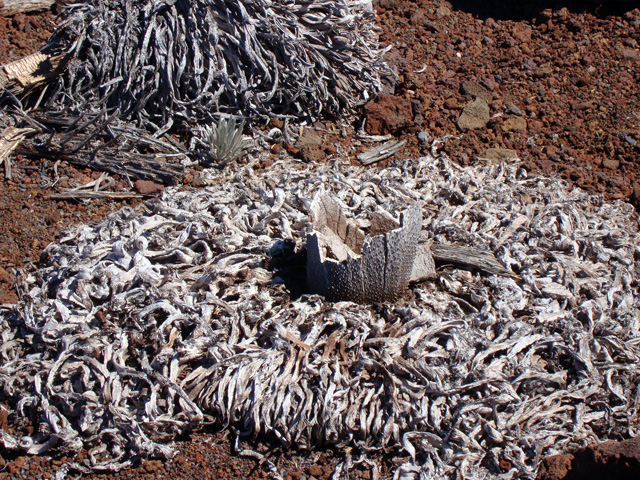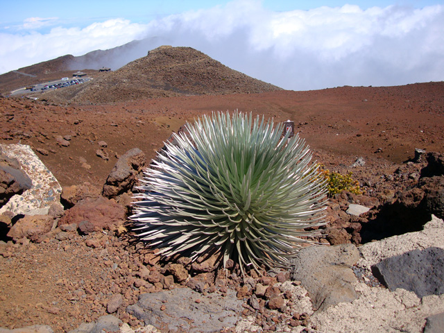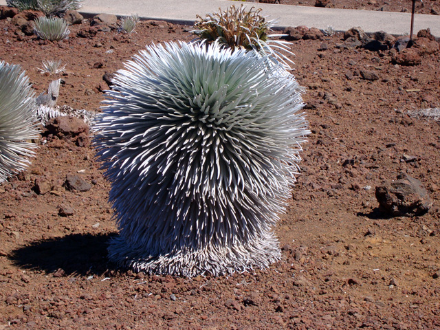 Now THAT is an odd-looking plant. From Wikipedia: The rare Haleakalā silversword is found on the island of Maui at an elevation of 6,900 to 9,800 ft on the dormant Haleakalā volcano — on the summit depression, the rim summits, and surrounding slopes — in Haleakalā National Park. The Haleakalā silversword has been a threatened species as defined by the U.S. Fish and Wildlife Service, since May 15, 1992. Prior to that time, excessive grazing by cattle and goats, and vandalism inflicted by people in the 1920s, had caused its near extinction. Since strict monitoring and governmental protection took effect, the species' recovery is considered a successful conservation story, although threats remain.