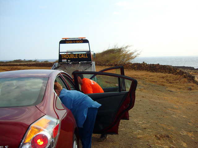 Why yes, it is! Bud came through! And pretty soon we'll be on our way again. But before we leave, let's see if our very nice but extremely confident tow truck driver will be able to start the Malibu. He believes Doug and Bill are a couple of helpless rubes and he's going to work a little magic with the key-fob system and start it right up. He'll show these tourists a thing or two. But he can't start it either.