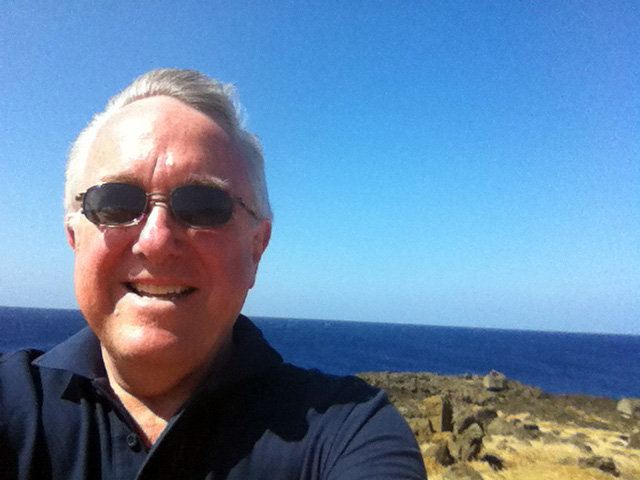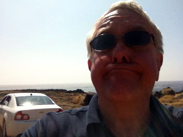 Today we're going to take an excursion around the south end of the island and up to Hawaii Volcanoes National Park. Our starting point, the hotel, is over there on the western shore of the island, right about in the middle, where if you squint you can see the town of Keauhou.