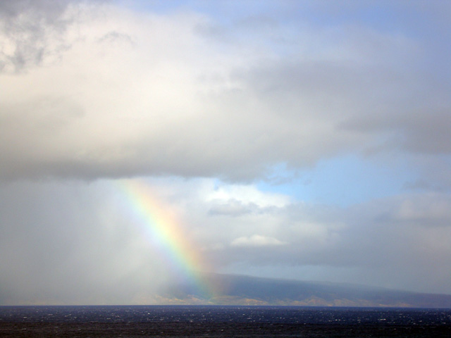 It's morning, and there's a rainbow! Bonnie has been counting whales. That island over there is Lana'i.