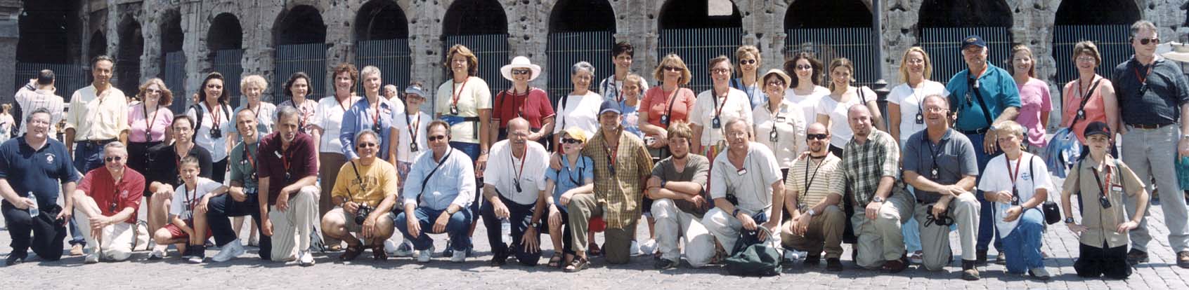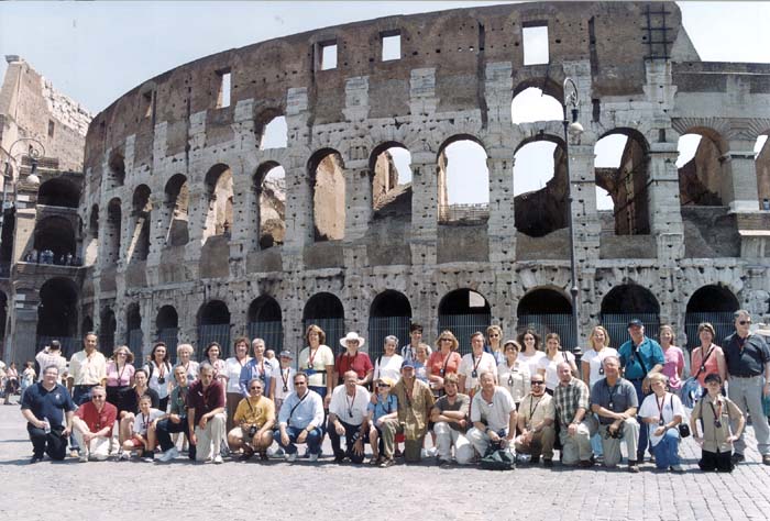 So Sid Fulford comes up with this idea that he wants to go to Italy in 2003, and I want to go, and Claudia wants to go and Margia wants to go, and before you know it, we've got a trip planned! Sid thinks we should rent a car and drive everywhere, but I've been to Italy before, and I know better. No way you're going to get me behind the wheel in a country full of automotive lunatics. If I want that, I can just drive around Washington. Nope, I say, the way to go is with a tour group, where *they* handle the details and our only major responsibility will be to enjoy. So Sid comes up with this tour from Globus that looks pretty good, and after a couple of high-tech chats in which Sid calls me from Muscle Shoals, and I conference Claudia in Tupelo, and Claudia conferences Margia in Nashville, we all sign up and wait for July. Sid thinks I should fly to Nashville so we can all travel to Europe together, but I think he has a screw loose. I can get there faster flying out of National Airport through Newark, and besides, my friends from the South are flying Delta (through Atlanta, naturally) and I want to fly Continental because I have a gazillion frequent flyer miles on Continental which I can use to upgrade to First Class. Which I do. And can you believe that when I arrive in Italy, nobody who flew coach on Delta through Atlanta wants to hear about my luxurious, roomy first-class recliner and the gourmet meals the onboard chef just wouldn't stop serving and the concierge who kept stopping by to see if everything was OK and my personal retractable television screen, and my toiletries kit complete with earplugs, slippers and eyeshades? Can you believe it? They just want to fuss about their scrunchy seats. Well, I don't care. First Class is good, let me tell you. We ended up with a fantastic group of people on the Globus tour. No whiners. No complainers. Everybody out to have a good time, from kids to old-timers. Here's a picture of the crew: