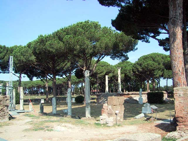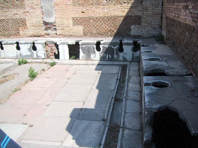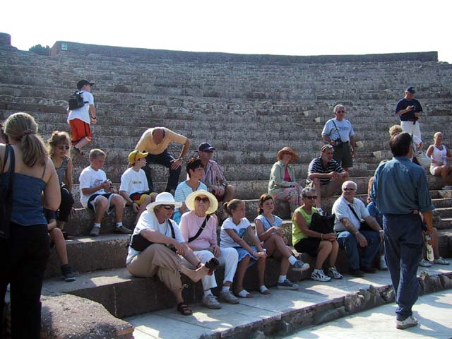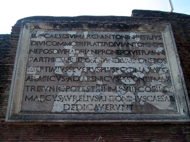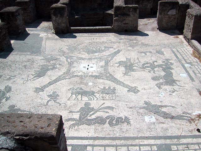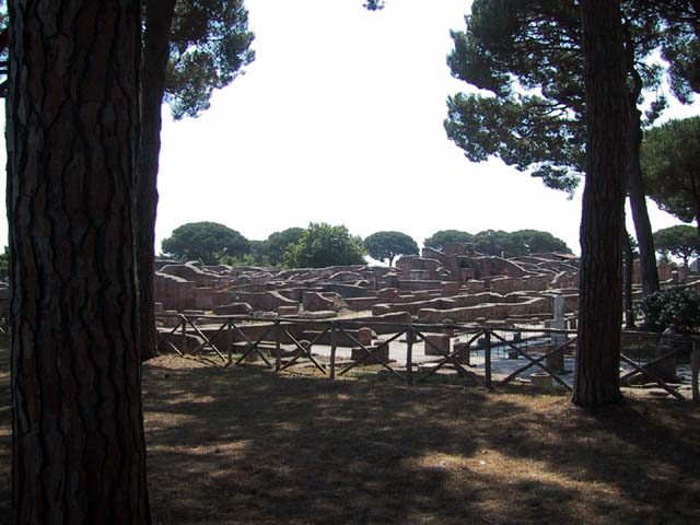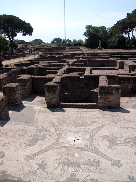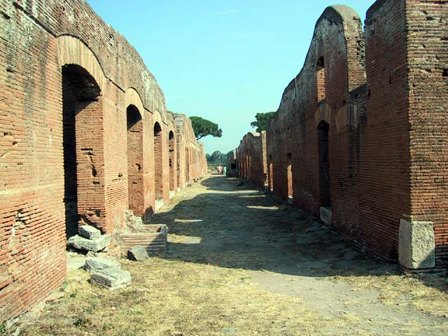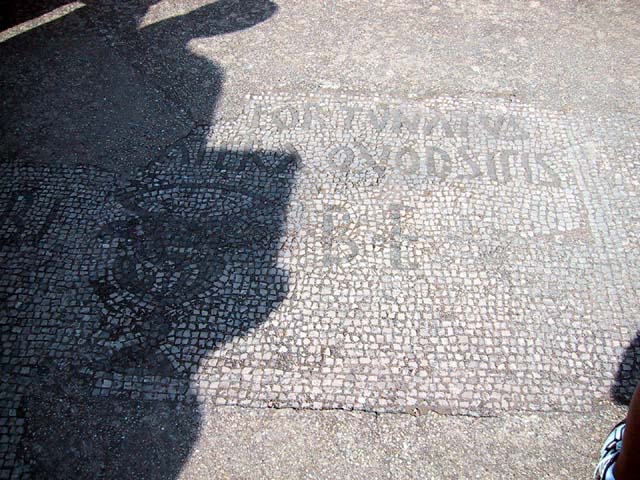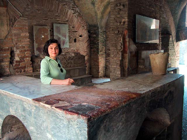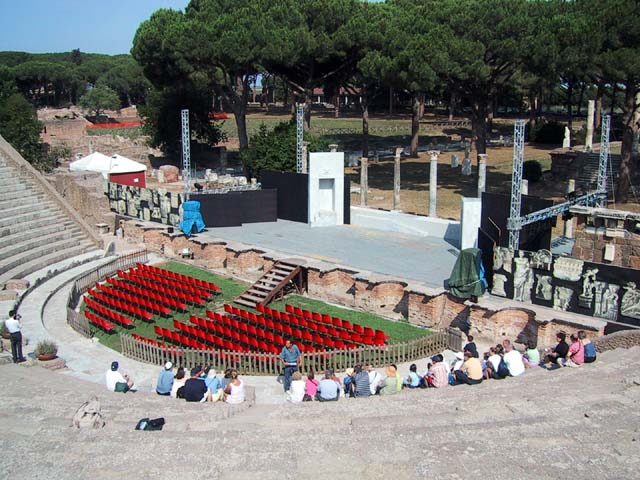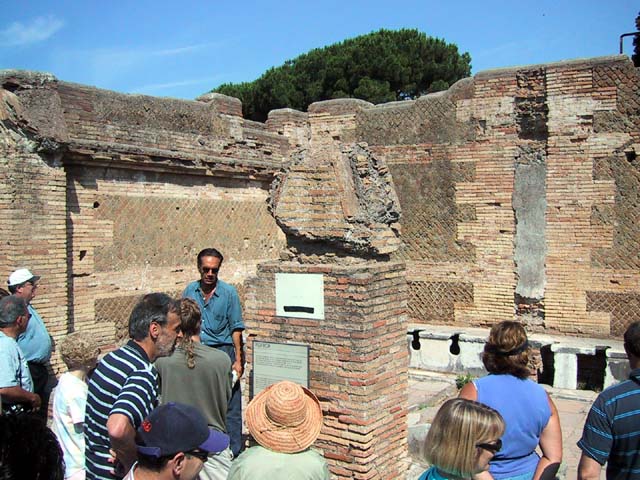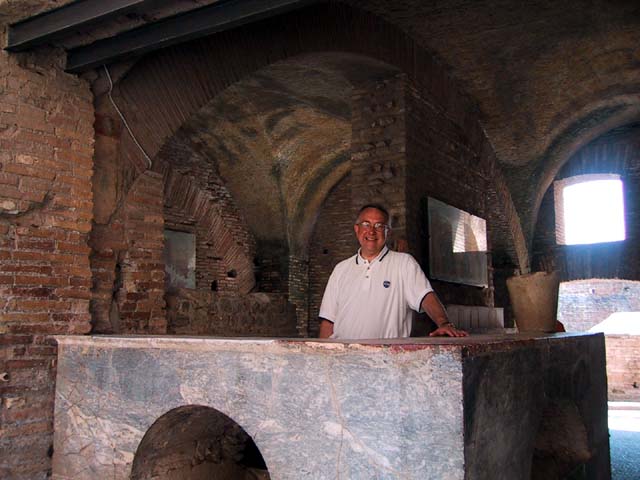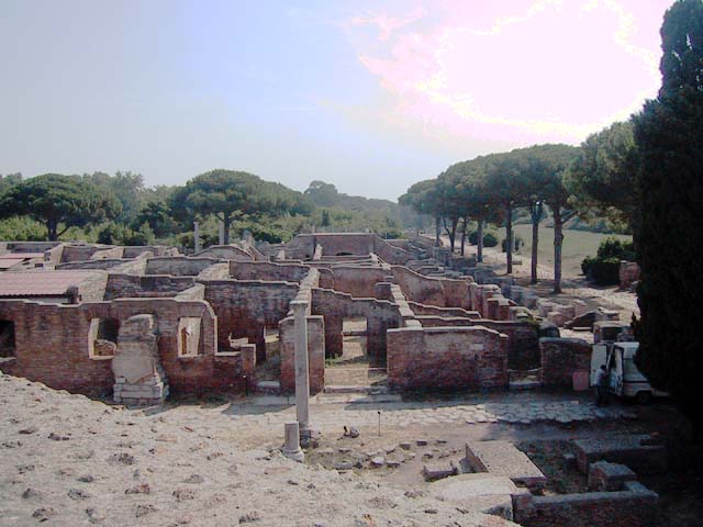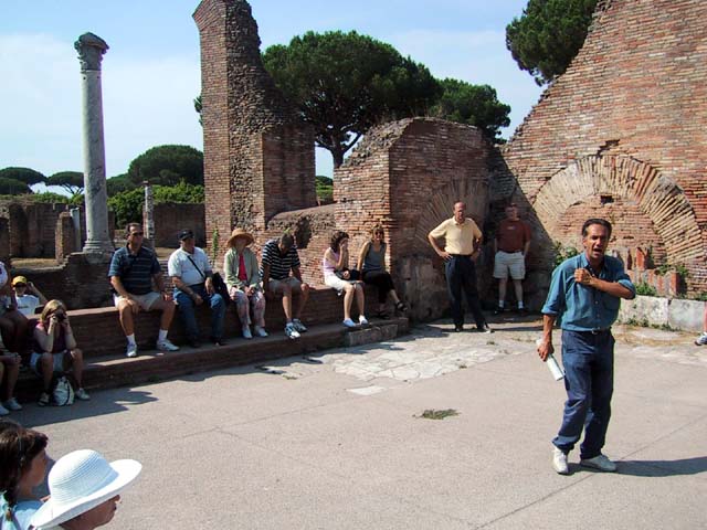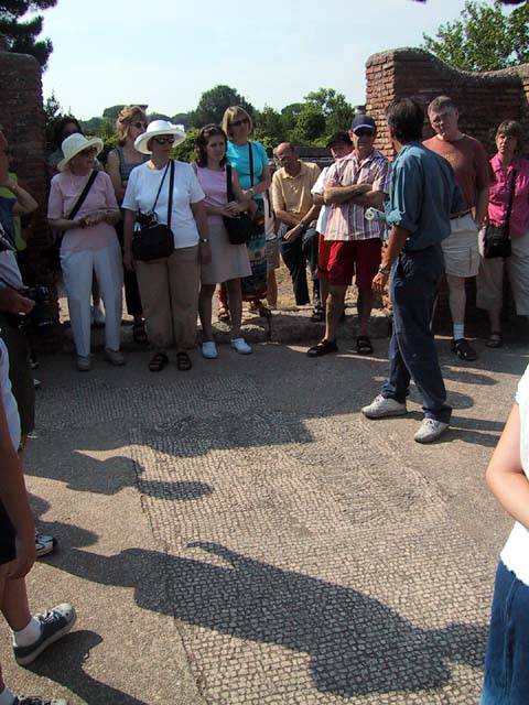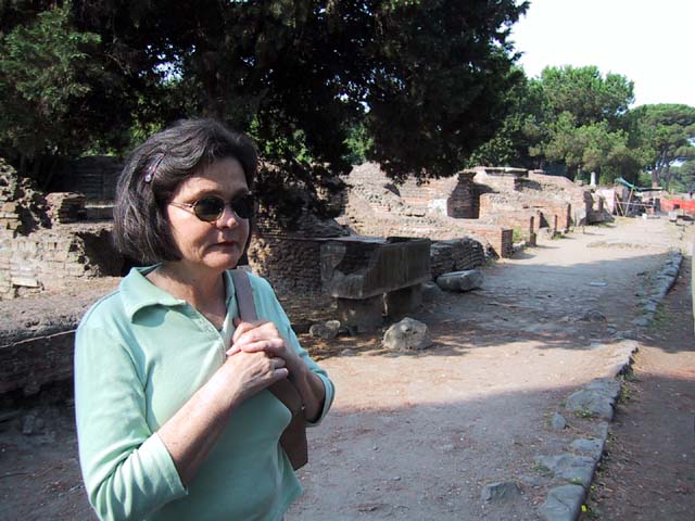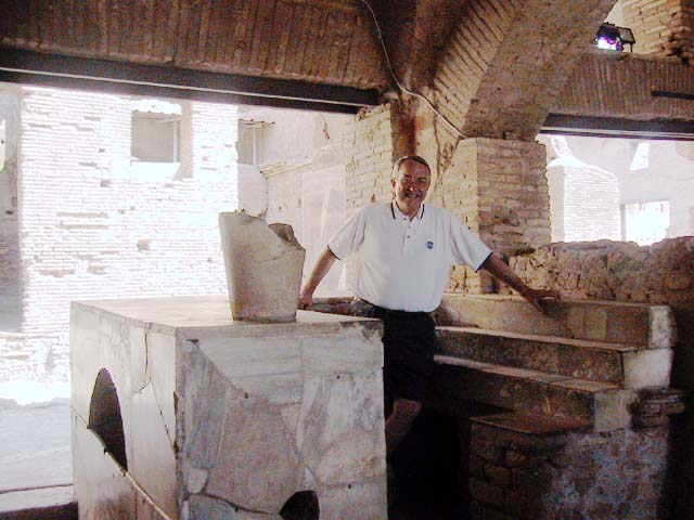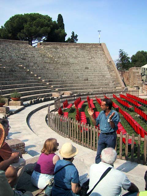The next morning we left Rome and headed for its old port city, Ostia. Seems Ostia was buried by Tiber floodwater about 2,000 years ago, and back in the 1930's Mussolini dug it up. It's not as well-preserved as Pompeii, but still it was fun to poke around the place. That's Stefano again, still a fine guide; still uninterested in questions. Margia contemplates Ostia. A mosaic in the road. It's an advertisement for the House of Fortunatus, a local wine shop. It says, "Thirsty? Drink." 2,000 years ago this was a thriving city. Stefano discusses road signs in ancient Ostia. Bi? Be. There once was a temple here. A plaque, commemorating the dedication of an amphitheater. The amphitheater. Pretty good acoustics, actually. Workmen were preparing the stage for a performance. Part of what's left of Ostia. The nosebleed section. Stefano could become quite animated when describing Roman baths. The public potty. Stefano discusses the finer points of using a public potty in the time of the Caesars. About 2,000 years ago, this was a restaurant. Well, of course it was. And it would be perfectly functional today. Stefano said they served fish that they'd soaked in vinegar and allowed to rot in the sun for a few days. Yum, yum. Italian food. Looks like Ostia has done a little rotting in the sun itself. This was a mosaic in the floor of the Neptune baths. What's left of the Neptune baths.