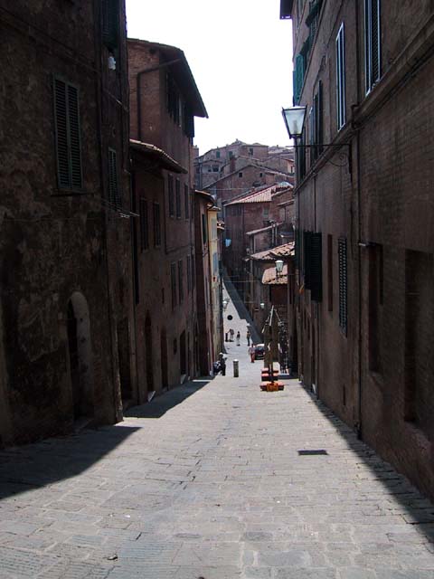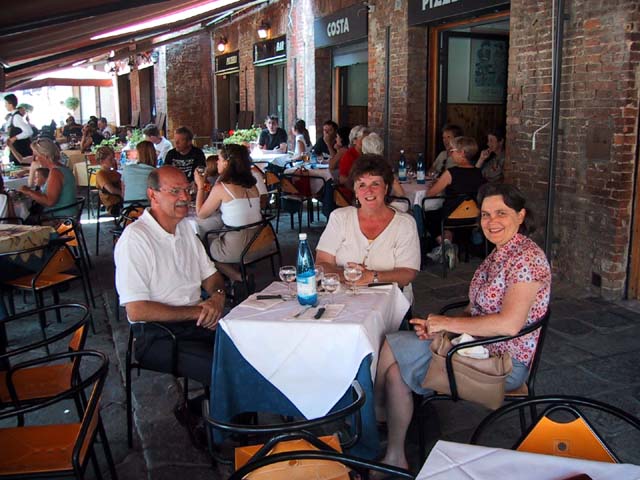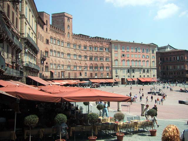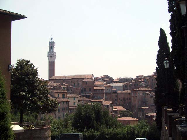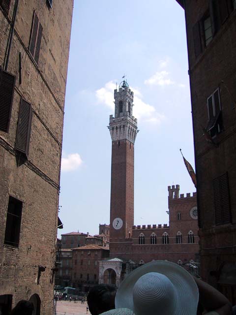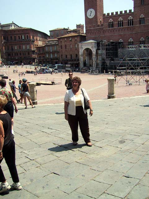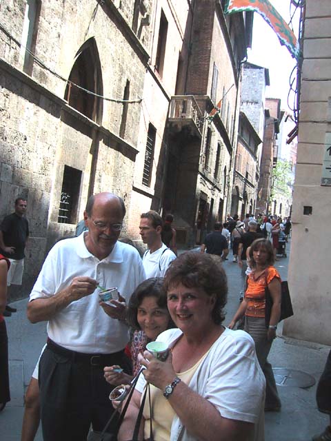 Siena is another town with towers and narrow streets. See what I mean? A narrow street. And a tower. Every year Siena has a big horse race in this plaza. The race, called the Palio, takes 90 seconds, but the preparation takes a year. Claudia strolls in Siena. The races are held right there behind her. Margia and Sid take pictures of me taking pictures of them. Must have been the heat. Another sidewalk cafe. Another bottle of cool water. Ahhhh. And gelati. Don't forget the gelati. Good, huh? |