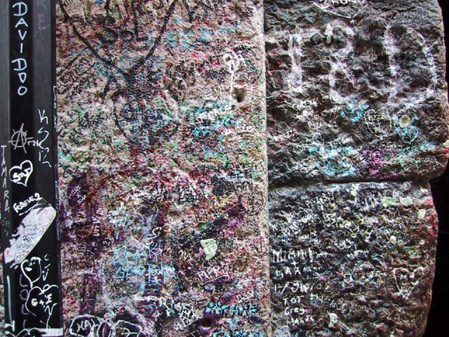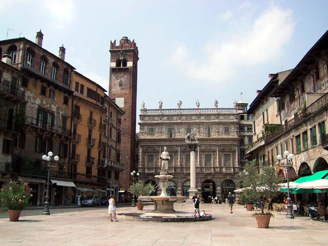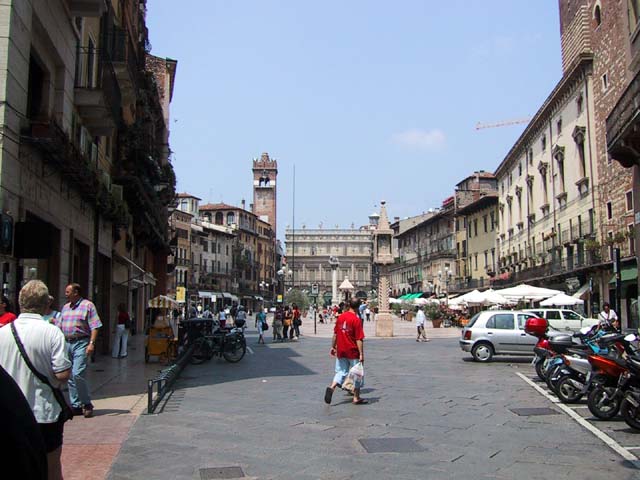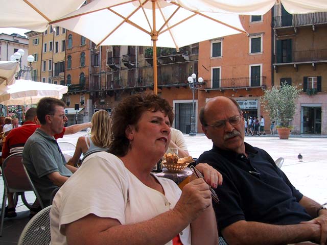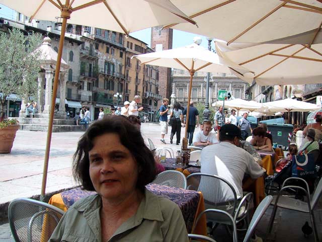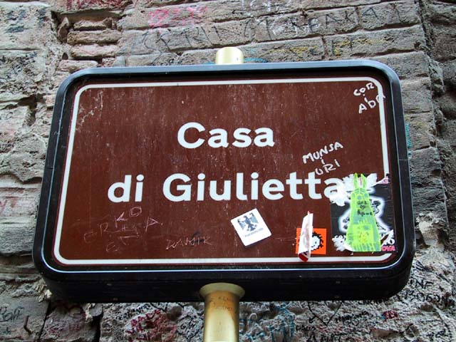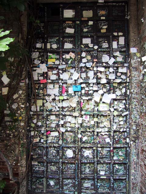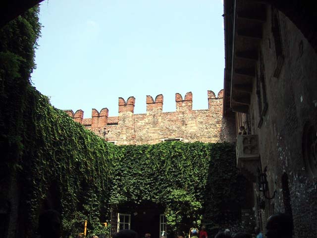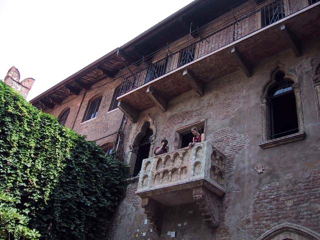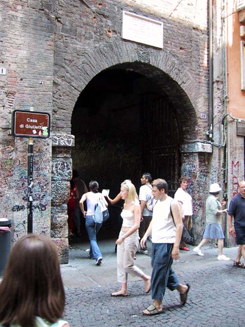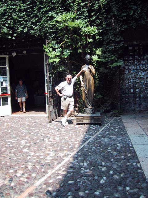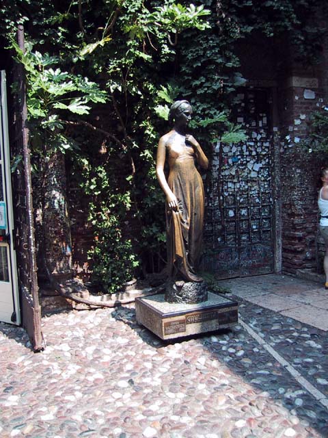 Our next stop that Sunday morning was Verona. There wasn't much going on in Verona, either. But the sidewalk cafe offered canned Lipton iced tea, and even a little bit of shade. So do you remember why Verona is famous? The answer is through that arched opening. It's the home of Romeo and Giulietta. Young lovers from all over the world deface the city walls of Verona with their names. Here's Juliet's courtyard. Those people up there on the right are standing on her balcony. But soft what light through yonder window breaks? It is the east, and those two clowns are the sun. There's Juliet herself. More graffiti. And notes. It's the custom, they say. Looks ugly to me. One part of the statue of Juliet is very shiny. Result of another custom. |
