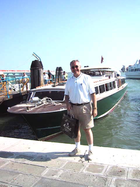 Here I am, back in Venice, by the excursion boat. And I don't want anybody who may happen to see this to get any ideas about Christmas presents just because I'm holding a La Perla bag. |