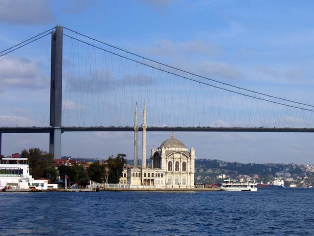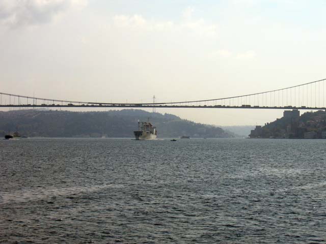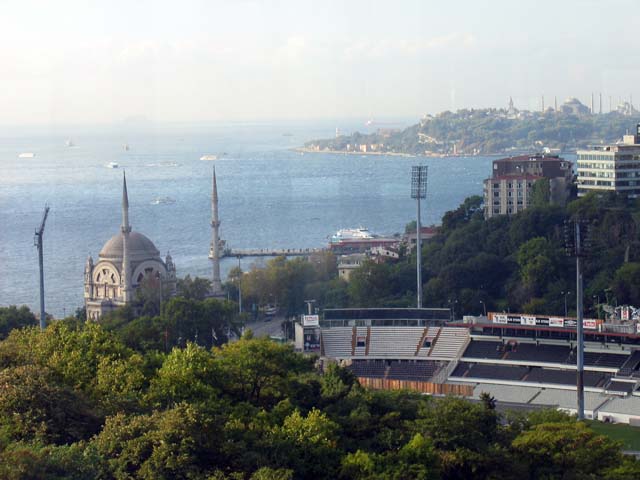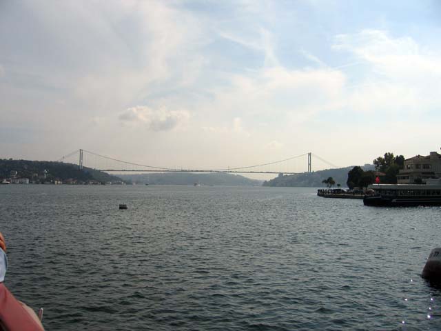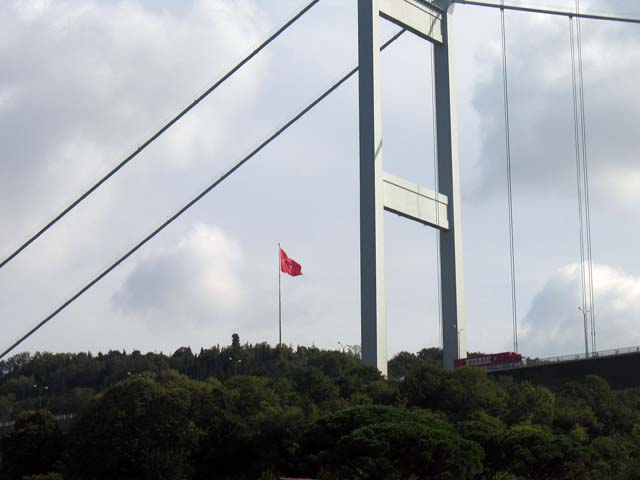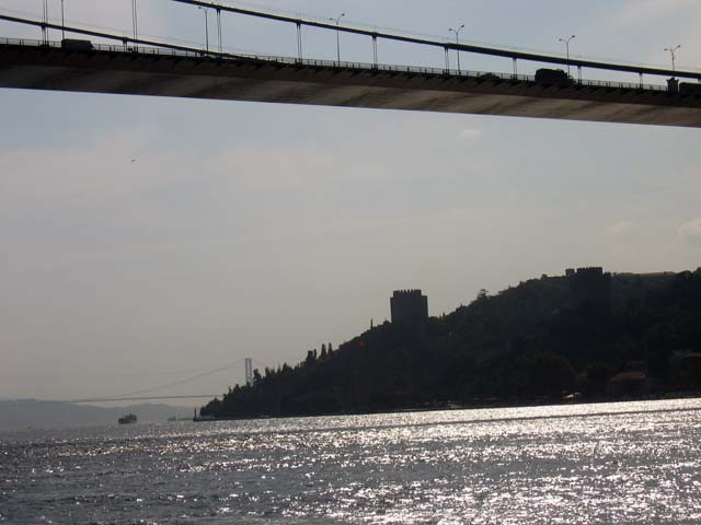 I think that must be the Bosphorus Bridge above us, and the Galata Bridge in the distance, crossing the Golden Horn. Maybe. I don't really know for sure. I guess I'm lost. But if I'm right, that has to be the Mecidiye Mosque over there on the right. But it doesn't look like a mosque. So sure, I'm lost. Somebody help me out here.