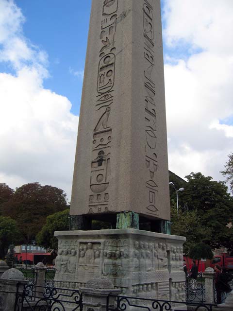 It stands on a base, made in the 4th century A.D., showing Thodosius I and his family in the kathisma (royal box) watching various events. The four sides depict a chariot race; Theodosius preparing to crown the winner with a wreath of laurel; prisoners paying homage to the emperor; and the erection of the obelisk itself.