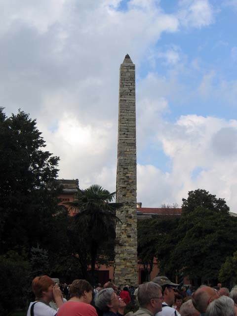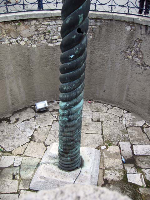 Another obelisk still standing but of unknown date, is usually referred to as the Column of Constantine Porphyrogenitus, after the emperor who restored it in the 10th century AD. It is also sometimes calle3d the Brazen Column, because it is thought to have once been sheathed in a case of bronze. Its dilapidated state owes much to the fact that young Janissaries (an elite military unit of the Turkish army organized in the 14th century and abolished in 1826 after it revolted against the Sultan) would routinely scale it as a test of their bravery.