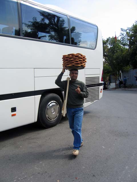 My friend Leon told me that when he was in high school in Turkey in 1965, there was a kid who sold round bread (simit) that he carried in a board perched on top of his head. So when I saw this, I figured it was the kid all grown up. And sure enough, Leon agreed that it's the very same person, and he looks really good for his age. Isn't life full of strange coincidences?